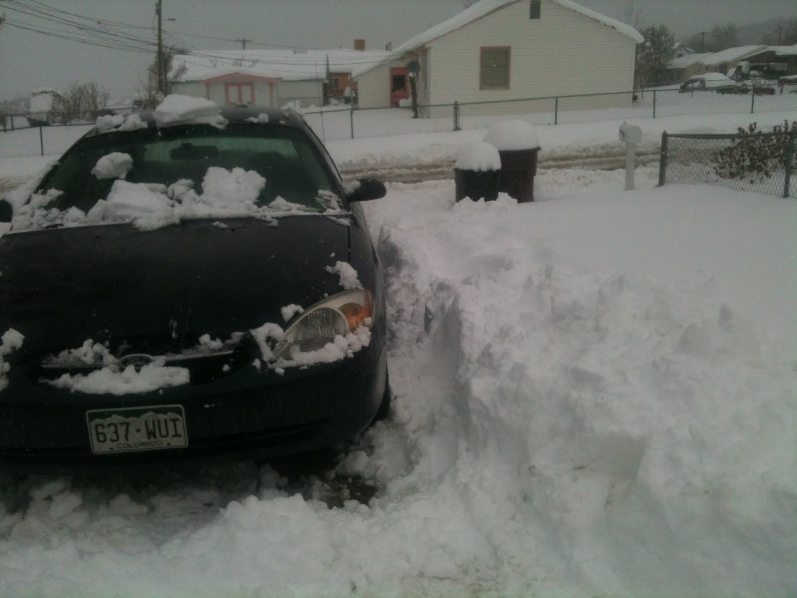 Yeah, it snowed. That second picture is the drift that was in front of my car in the driveway, you can see where my bumper was. Got dug out to where I can get out of the driveway and theoretically into the street, though plowing the street doesn't appear to be a priority for the city, so there's tire tracks in slush a foot deep all the way across the street. I have to go to work in about thirty minutes, so this ought to be interesting.